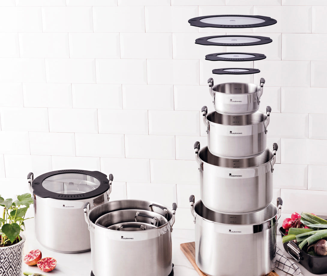 Diseño revolucionario de líneas rectas que permite apilar las piezas unas dentro de otras, ahorrando espacio en la cocina.