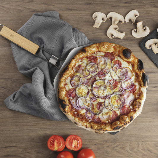 - Piedra refractaria: Consigue y mantiene la temperatura perfecta para hornear tus pizzas.