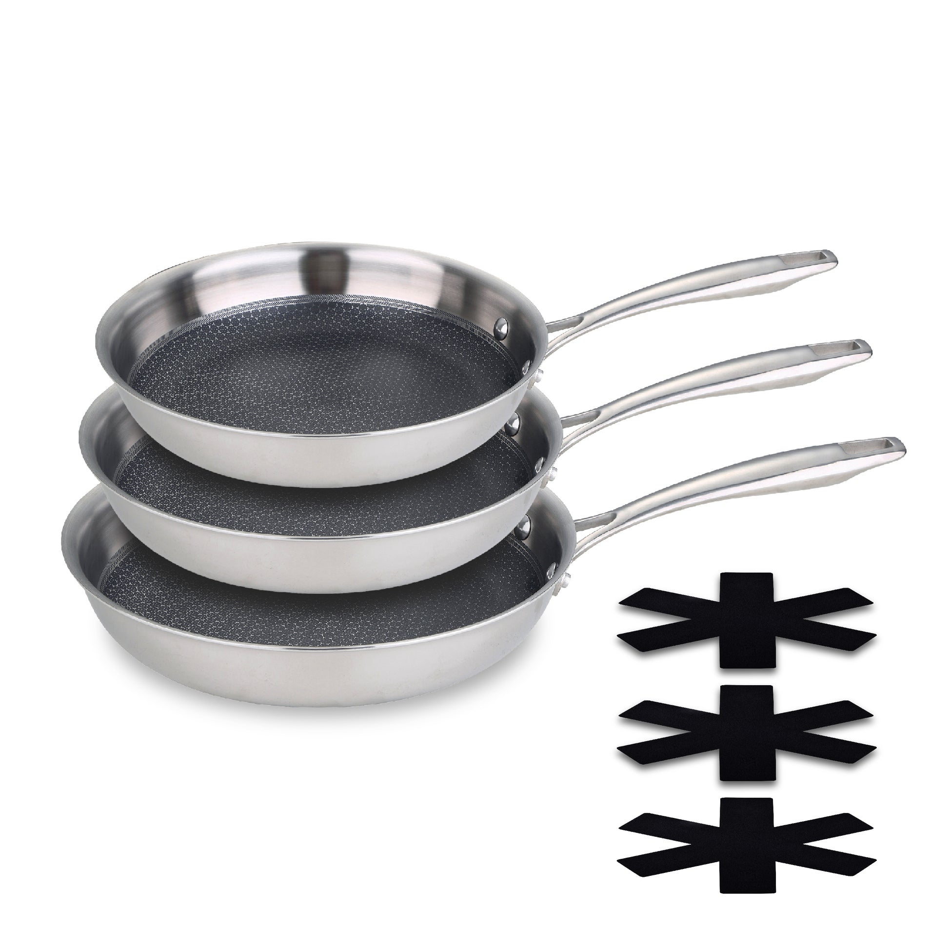 Sartenes fabricadas en acero inoxidable con un núcleo de aluminio y antiadherente Pallatium que te ofrece una experiencia digna de un chef y unos resultados de restaurante. Diseño elegante y sencillo que consigue la estética limpia y sofisticada de las mejores cocinas internacionales. Compuestas por 3 capas: núcleo de aluminio y acero inoxidable 18/10 en el exterior e interior, que permite que la pieza se caliente 3 veces más rápido que las sartenes convencionales de una capa. El acero inoxidable es un material muy resistente y robusto que permite una transmisión homogénea de la temperatura. Además, su capa antiadherente Pallatium es inusualmente dura y resistente, por lo que podrás utilizar utensilios metálicos sin dañar su estructura, manteniendo una gran vida útil del producto. La textura del fondo de panel de abeja ayuda a evitar el deterioro progresivo convirtiéndose en tu aliado para la cocina diaria.