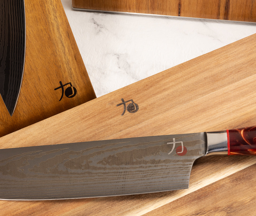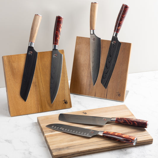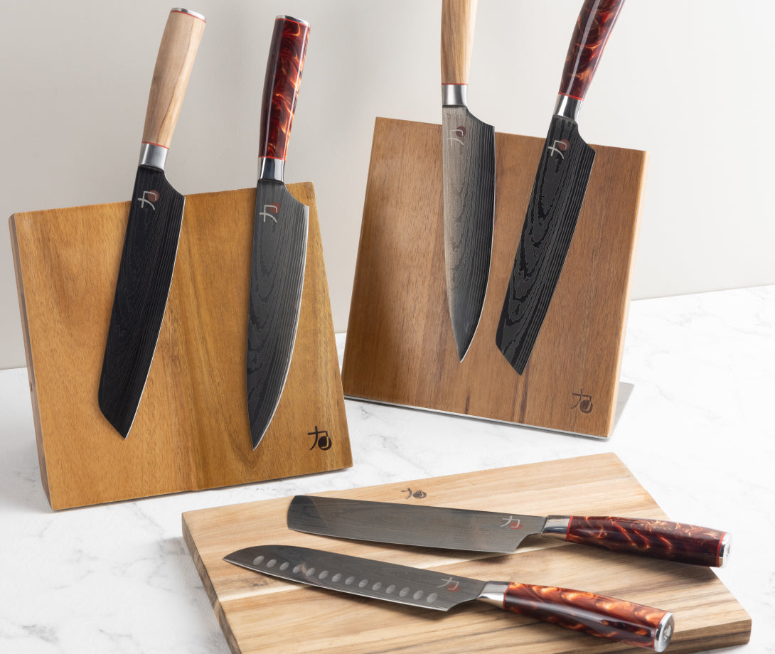Cada uno de ellos, especializado en un tipo de alimento o corte: Los cuchillos santoku para cocinar carnes, el cuchillo Nakiri para trabajar con vegetales, el cuchillo Chef para todo tipo de alimentos y el cuchillo picador para aquellos trabajos de precisión.