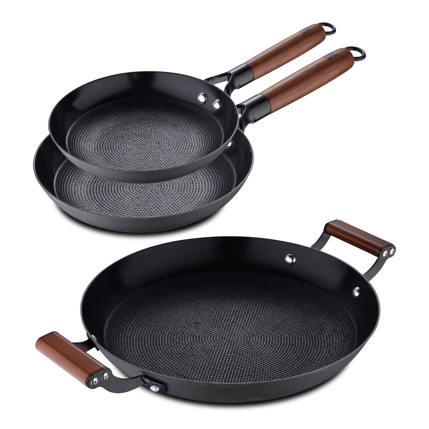 Juego de 2 sartenes de 20 y 24 cm y asador redondo de 32 cm de MasterPRO de hierro prensado - Odin