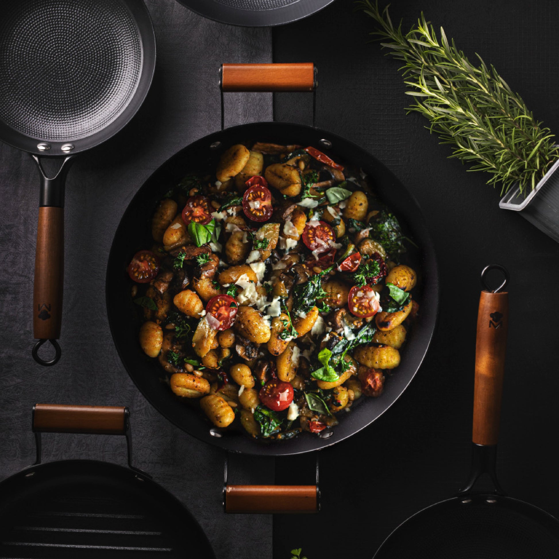 La colección se compone de sartenes en 3 tamaños, cazo, wok y 2 tipos de planchas en diferentes dimensiones para poder cocinar todo lo que te propongas.