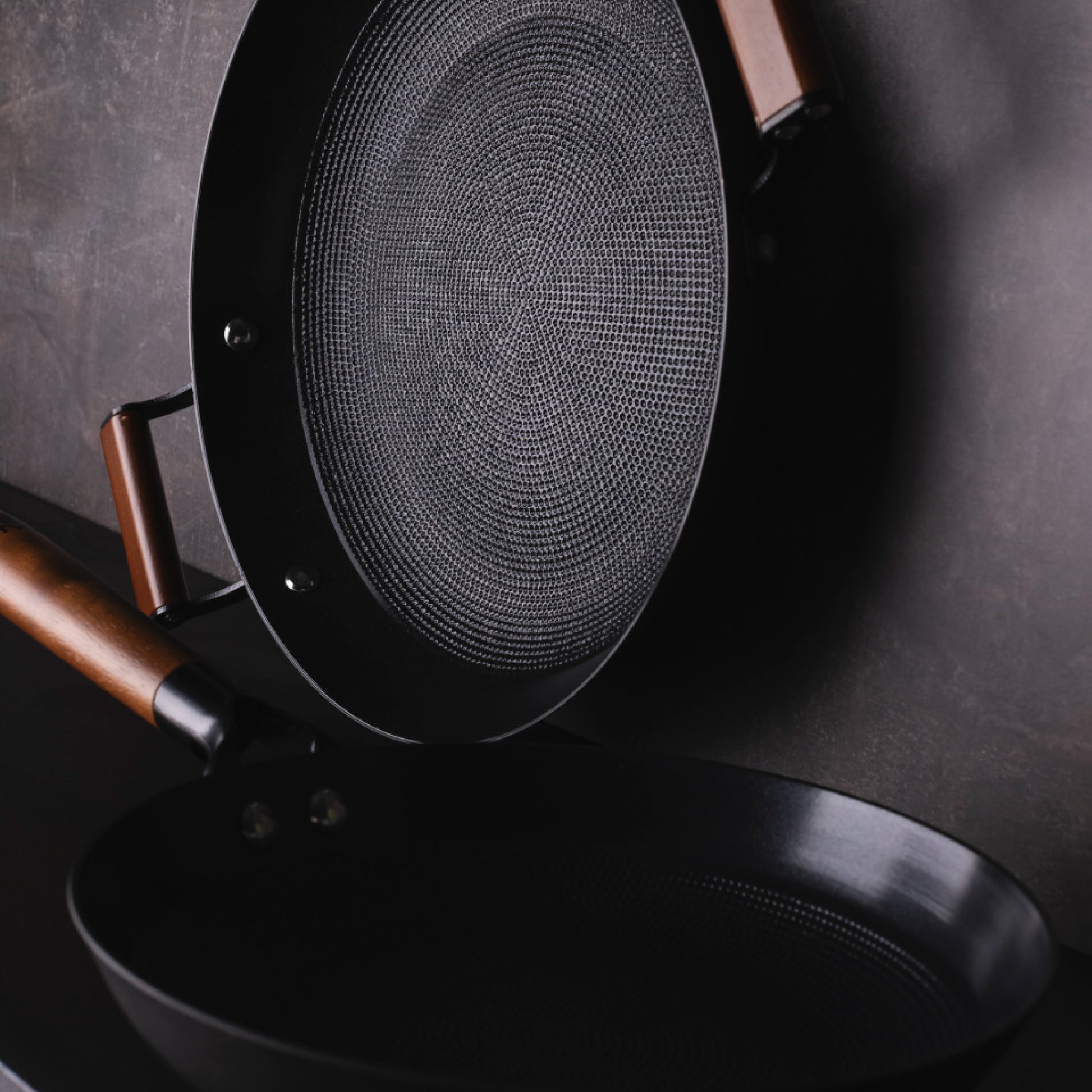 La colección Odín de MasterPRO está fabricada en hierro prensado, lo que le permite obtener los beneficios del hierro en la cocción, como la durabilidad, así como la máxima retención del calor, pero haciéndola un 50% más ligera que las sartenes de hierro fundido.