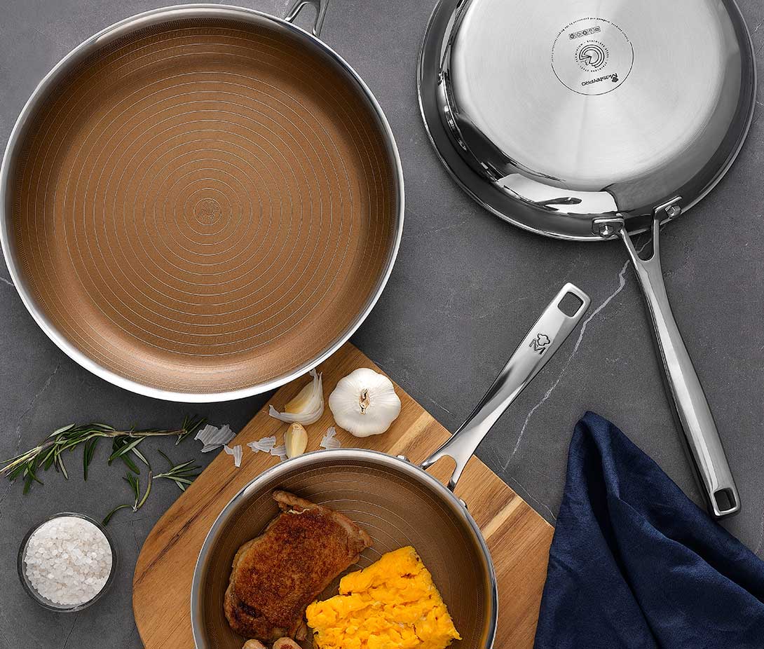Su hermosa estética resalta en cada cocina: relucientes matices metálicos de acero inoxidable y un exquisito dorado tornasol en su revestimiento es combinado con los aros plateado interiores , conformando una belleza de familia de sartenes.