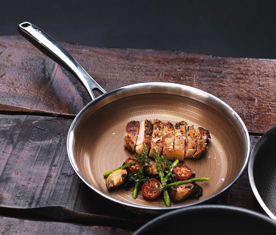 Giro 3 de MasterPro, es la sartén que utiliza la tecnología 3Ply para su comodidad y cuidado. Esta sofisticada tecnología consiste en dos capas de acero inoxidable de alta durabilidad y una capa de aluminio para un calentamiento rápido.