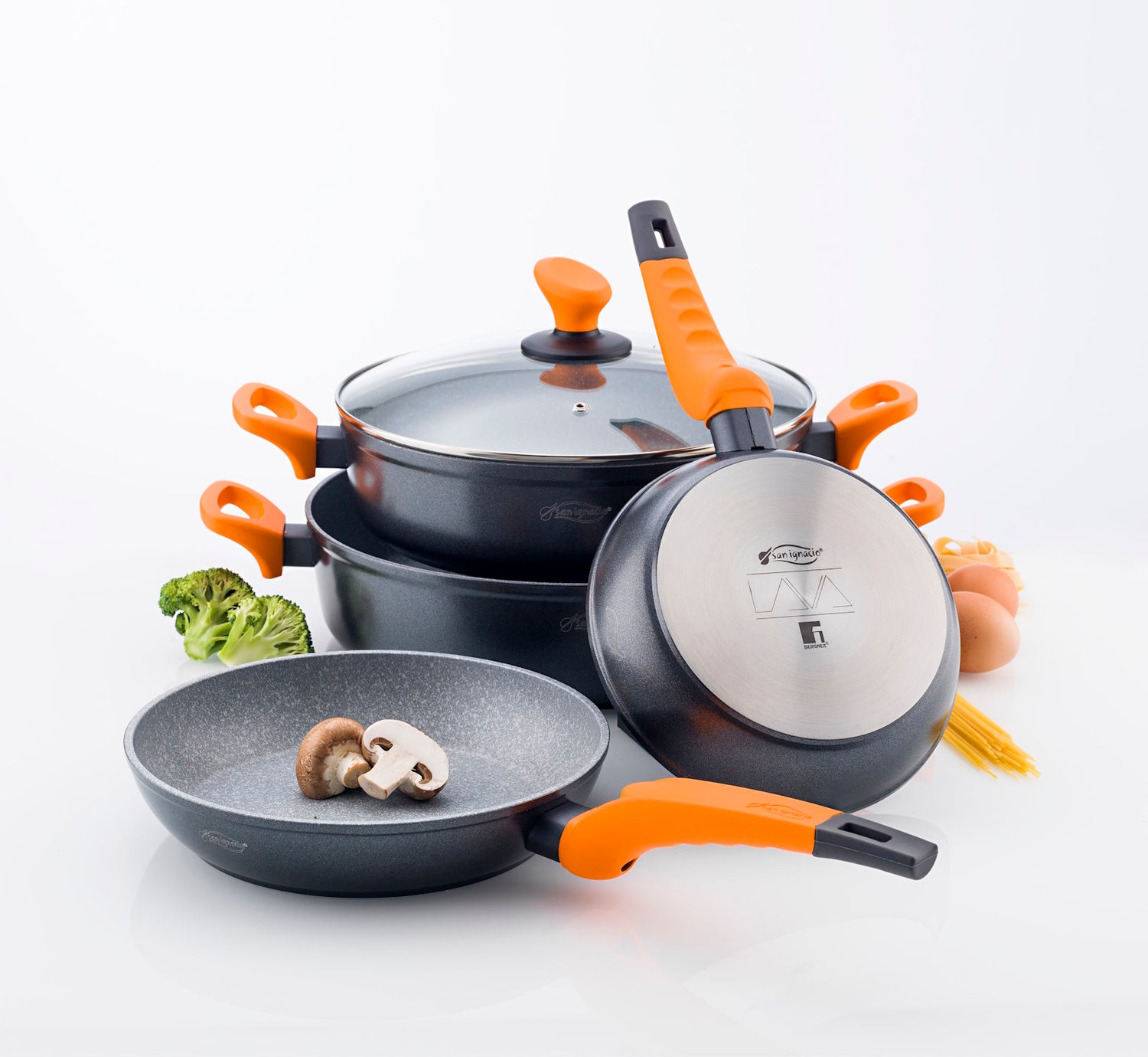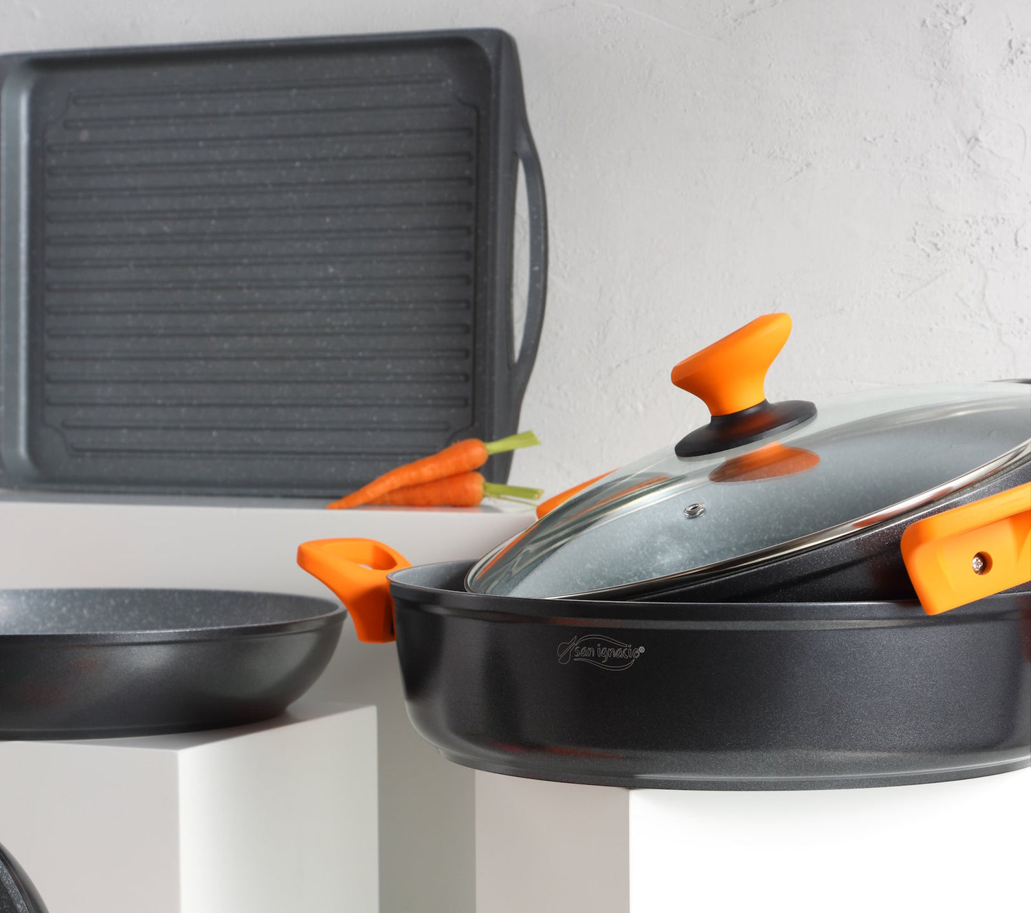 El diseño ergonómico de sus mangos en vibrante color naranja no solo ofrece comodidad, sino también un toque moderno que destacará en tu cocina. Si estás buscando un juego de sartenes de calidad que facilite tu día a día y sea compatible con todas las fuentes de calor, incluyendo inducción, la colección Lava es tu mejor opción.