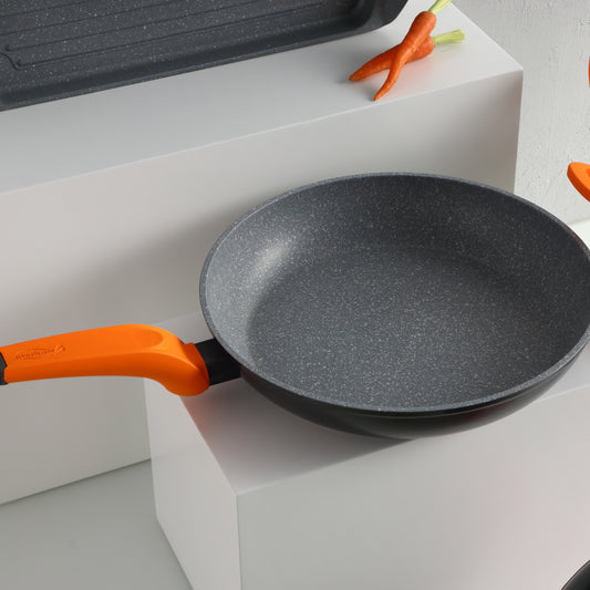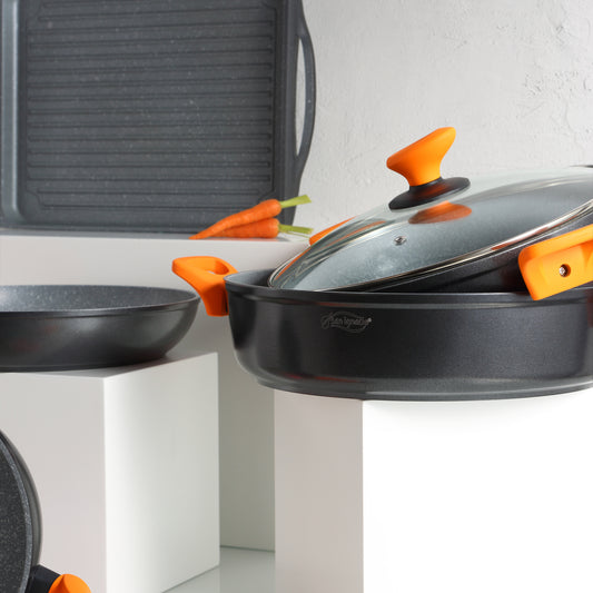 Este juego de sartenes incluye una plancha grill, ideal para asar carnes y verduras; una paellera para compartir deliciosos arroces; y una cacerola baja, perfecta para guisos y estofados. La combinación de materiales de alta calidad y su diseño ergonómico en naranja convierten a la colección Lava en una elección imprescindible para los amantes de la cocina moderna.